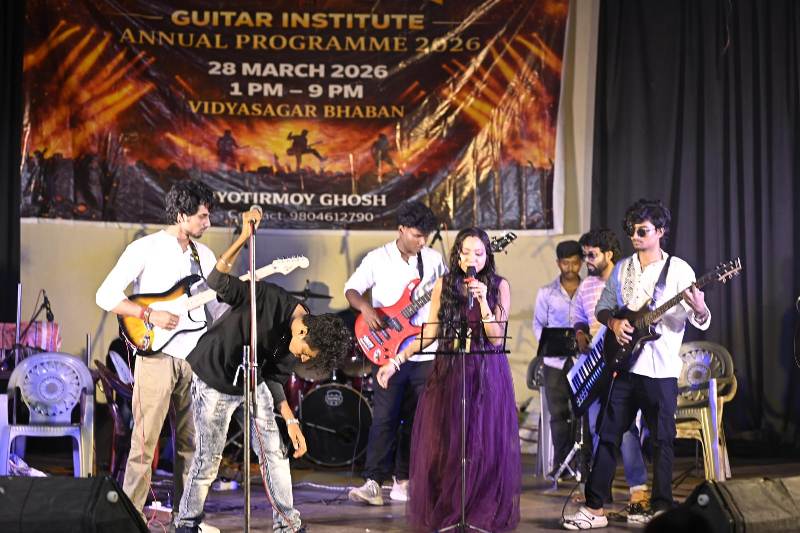 বিশেষ প্রতিনিধি, বারাসাত :রক অন গিটার ইন্সটিটিউট সম্প্রতি বারাসাত বিদ্যাসাগর কক্ষে বার্ষিক অনুষ্ঠান সাফল্যের সাথে করে দেখালো। প্রতিষ্ঠানের প্রায় ৩৫০ জন ছাত্র ছাত্রীরা নানা আঙ্গিকে বিভিন্ন অনুষ্ঠানে অংশ নেয়। প্রায় প্রতিটি শিক্ষার্থী অনুষ্ঠানে দক্ষতা দেখায়, সকলের প্রশংসা পায়। সংস্থার তরুণ শিক্ষক জ্যোতির্ময় ঘোষ জানান, তিনি ছাত্র-ছাত্রীদের ইন্ডিয়ান ও ওয়েস্টার্ন নোটেশনে বিভিন্ন গিটার শেখান এছাড়া ড্রাম, কিবোর্ড সহ অন্যান্য বাদ্যযন্ত্র ও গান শেখানো হয়। বারাসাত থেকে দমদম বা বনগাঁ পর্যন্ত ছাত্রছাত্রী রয়েছে জ্যোতির্ময়ের। তারা যেমন শিখছে তেমনি বিভিন্ন অনুষ্ঠানেও নিয়মিত অংশগ্রহণ করছে। জ্যোতির্ময় জানায়, প্রতিষ্ঠানের ছাত্রছাত্রীর সংখ্যা ৪০০র বেশি। তাদের ছাত্রছাত্রীরা স্বীকৃত প্রতিষ্ঠান থেকে পরীক্ষা ও নিয়মিত দিয়ে থাকে ।জ্যোতির্ময় জানান, ছাত্রছাত্রীরা ভবিষ্যতে নানা ভাবে পারদর্শিতা দেখাক এবং যদি মনে করে সুনামের সাথে গিটার কে পেশা হিসেবে গ্রহণ করবে তাহলে তারা সেটাও করতে পারে। এখন দেখার তরুণ এই গিটার শিক্ষকের কর্মকাণ্ড কতদূর বিস্তৃত হয়।